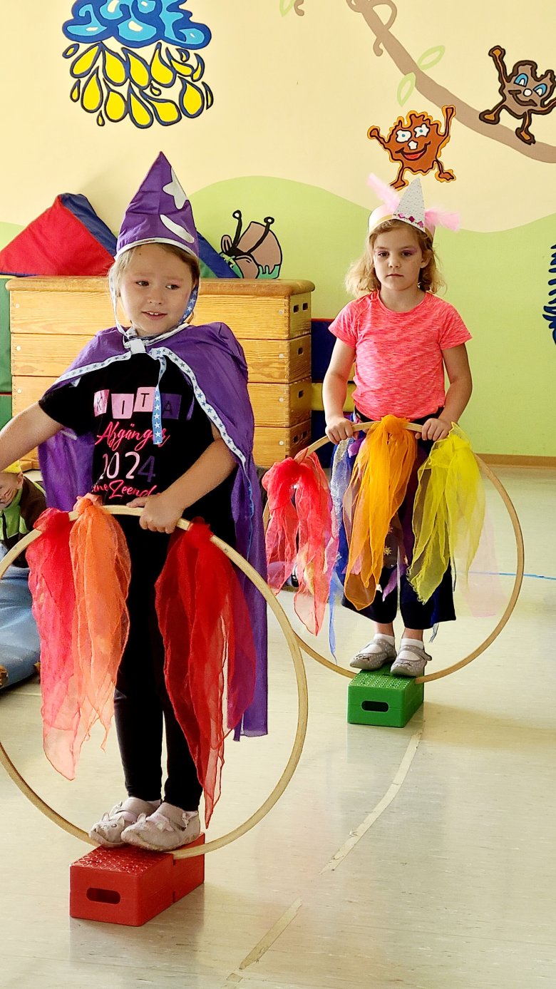 Gespannt warteten die Eltern vor dem zum Zirkuszelt umgebauten Turnraum. Jeder Gast bekam ein Eintrittsbändchen. Die Aufführung startete mit der gefährlichen Tiger-Dressur. Die mutigen Raubtiere absolvierten einen Parcours und sprangen durch brennende Reifen. Es folgte die begabte Zauberin Laralina, die nicht nur Kaninchen, nein gleich eine Vielfalt von Tieren aus ihrer Kiste zaubern konnte. Eine Akrobatikgruppe zeigte ihr Können. Einhörner traten auf und am Ende gab es ein großes Finale in Form eines Tanzes mit bunten Tüchern, Seifenblasen und vielen Luftballons. Selbst Popcorn fehlte nicht.