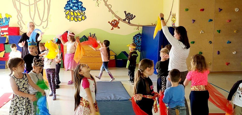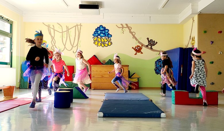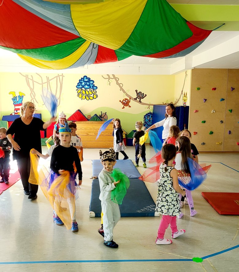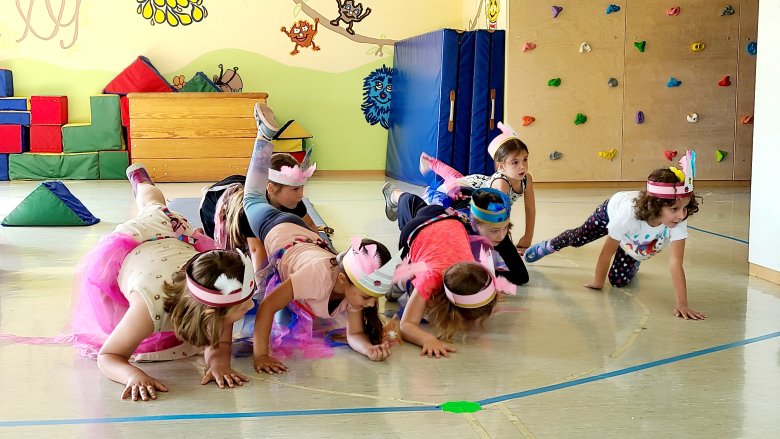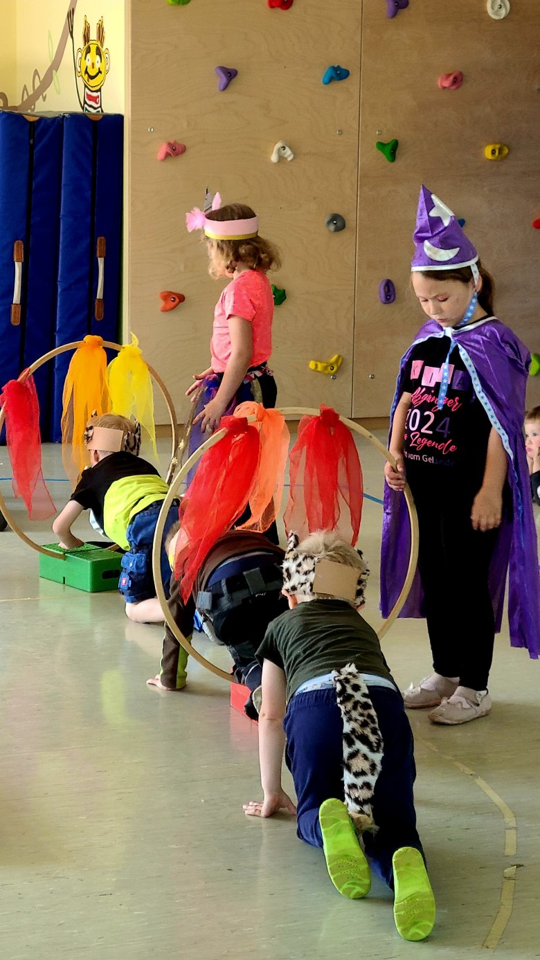 Gespannt warteten die Eltern vor dem zum Zirkuszelt umgebauten Turnraum. Jeder Gast bekam ein Eintrittsbändchen. Die Aufführung startete mit der gefährlichen Tiger-Dressur. Die mutigen Raubtiere absolvierten einen Parcours und sprangen durch brennende Reifen. Es folgte die begabte Zauberin Laralina, die nicht nur Kaninchen, nein gleich eine Vielfalt von Tieren aus ihrer Kiste zaubern konnte. Eine Akrobatikgruppe zeigte ihr Können. Einhörner traten auf und am Ende gab es ein großes Finale in Form eines Tanzes mit bunten Tüchern, Seifenblasen und vielen Luftballons. Selbst Popcorn fehlte nicht.