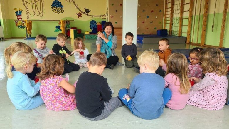 Die Ruhe breitet sich sofort aus, wenn die Kinder mit Ana in den Turnraum gehen und sich erwartungsvoll zu ihr setzen. Ana startet angenehme, leichte Klaviermusik und leitet die ersten Bewegungsübungen an. Die Kinder machen ihr nach, werden zu Schmetterlingen oder zum Baum, formen mit ihren Armen den Schnabel eines Vogels oder malen mit der rechten Hand einen großen Regenbogen (von links nach rechts), lassen Bälle steigen und bewegen sich in Wellenform. Es sieht dynamisch aus und die Kleinen sind konzentriert dabei.