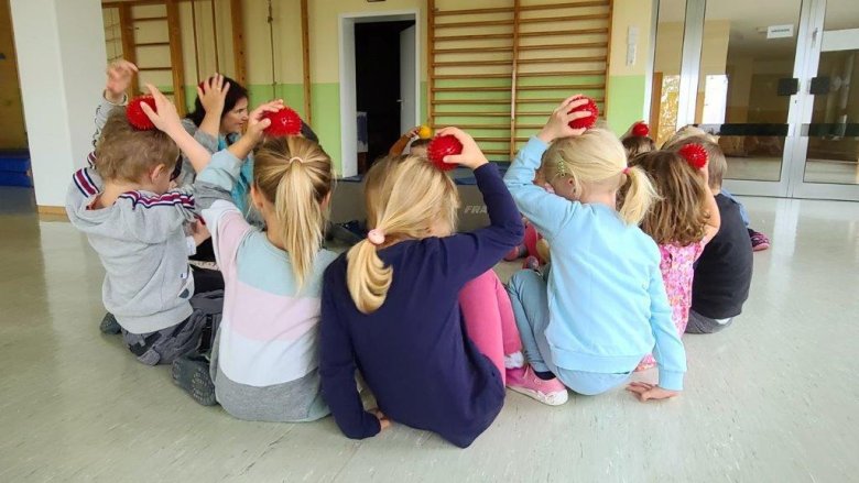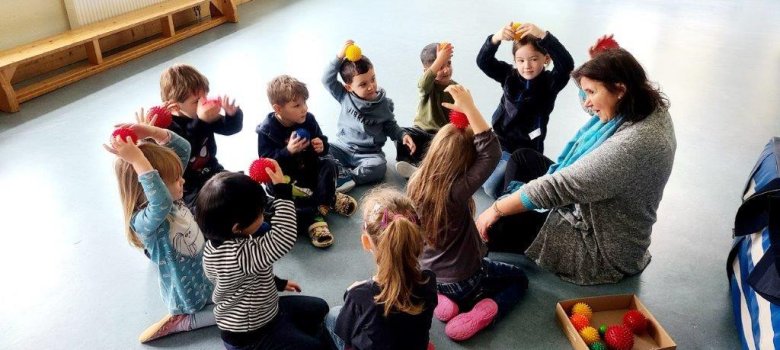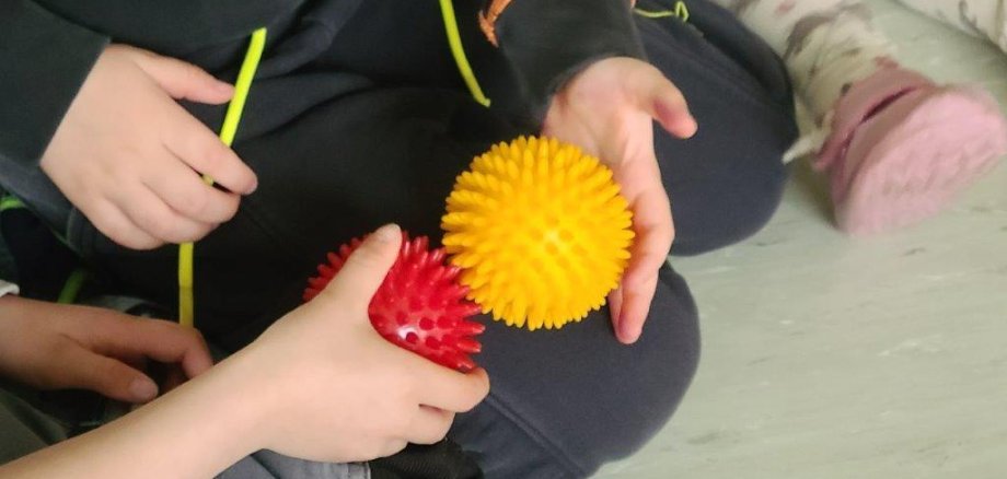 Dann werden Igelbälle verteilt. Jedes Kind bekommt einen. Sie massieren sich die Hände, Beine, Schultern und sogar den Kopf, indem sie den Ball über die entsprechenden Partien kreisen lassen, was neben der entspannenden Wirkung gleich noch eine Geschicklichkeitsübung beinhaltet.
