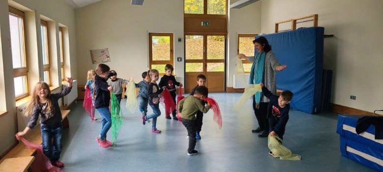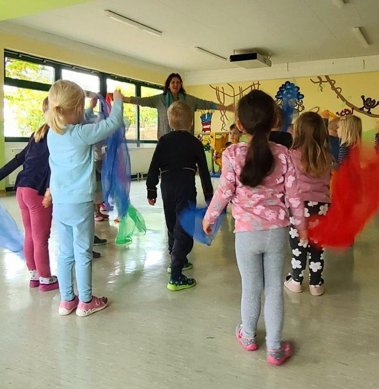 Im letzten Teil der Stunde bewegen sich die Kinder mit Chiffontüchern durch den Raum, die sie anmutig schwingen. Sie genießen die Bewegungsfreiheit und den Effekt der fliegenden Tücher. Gleichzeitig wirkt das Bild koordiniert.