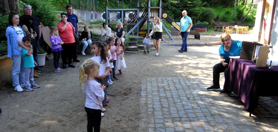 Einen gemütlichen Nachmittag verbrachten Kinder und Eltern der Regentropfengruppe bei strahlendem Sonnenschein im Garten ihres Kindergarten Regenbogen in Brachttal. Die Kinder begrüßten ihre Familien mit dem Willkommenslied, das die Gruppe im täglichen Morgenkreis singt. So bekamen die Eltern Einblick in den Kindergartenalltag. Es folgte die Vorführung des „Dinotanzes“. Doch nicht nur das, im nächsten Schritt wurden die Eltern von ihren Kindern zum Mittanzen aufgefordert. Es machte Spaß zu sehen, wie die Kinder vertraute Rhythmen klatschen und tanzen konnten, während die Eltern hoch konzentriert mitzuhalten versuchten. Am Ende entstand ein schönes Gesamtbild, das den Kindern und ihren Gästen Freunde machte.