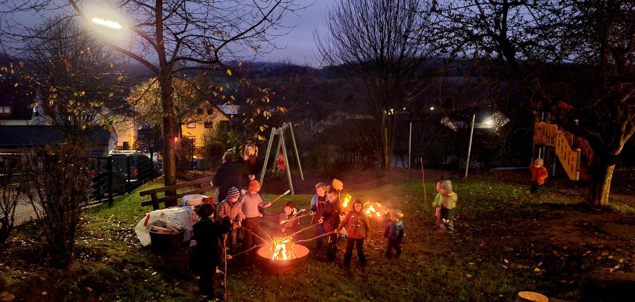 Das Martinsspiel begann. Nach der Mantelteilung, die die Kinder inszenierten, verschenkten sie symbolisch Stücke des Mantels an die Gäste der Kita Regenbogen, als Erinnerung an seine guten Taten. Die kleinen Martinszüge setzten sich in Bewegung. Später gab es Stockbrot in der Schatzkiste am Feuer. Am späten Nachmittag des 11. November leuchteten in Brachttal nicht nur zahlreiche selbstgemachte Laternen, sondern auch die Augen von Kindern und Erwachsenen, die sich die Würstchen und heißen Getränke schmecken ließen und einen gemütlichen Abend miteinander verbrachten.