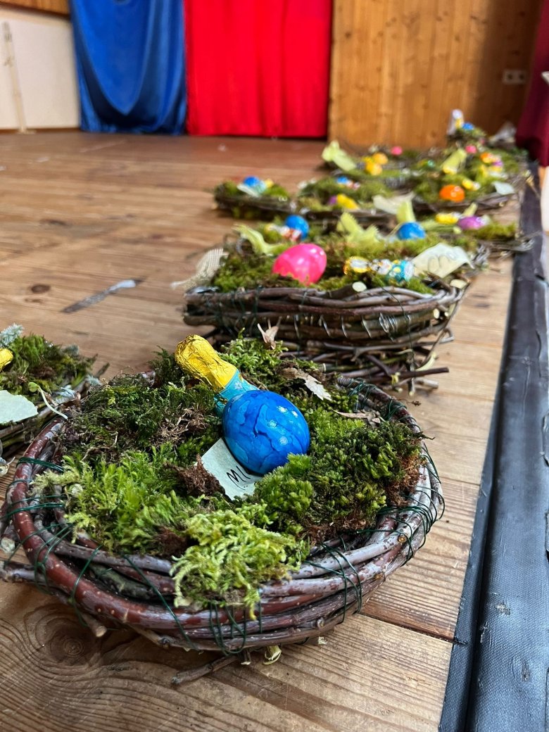 In der ersten Woche wurde ein Bastelnachmittag organisiert. Hier zog es die jungen Abenteurer hinaus in den nahegelegenen Wald, wo sie eifrig Naturmaterialien sammelten, um daraus Osternester zu basteln. Mit viel Kreativität und Engagement entstanden kleine Körbchen aus Astmaterial, die sie anschließend mit Nistmaterial füllten. Die Mühe wurde belohnt, als der Osterhase höchstpersönlich vorbeihoppelte und die selbstgebastelten Unikate mit einer Kleinigkeit füllte.
