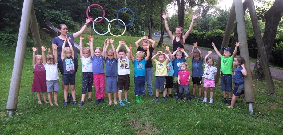 Die Zeichen stehen auf Olympia, als die Waldgruppe Grashüpfer der Kindertagesstätte Schatzkiste mit Mann und Maus zu ihrer Waldrallye aufbricht. Eltern, Kinder und Erzieherinnen trafen sich nachmittags am Kindergarten und absolvierten den spannenden Parcours durch den Wald oberhalb von Neuenschmidten und Schlierbach. Es war das Olympiafest schlechthin in der Metropole Brachttal und ein Ereignis von besonderer Seltenheit.