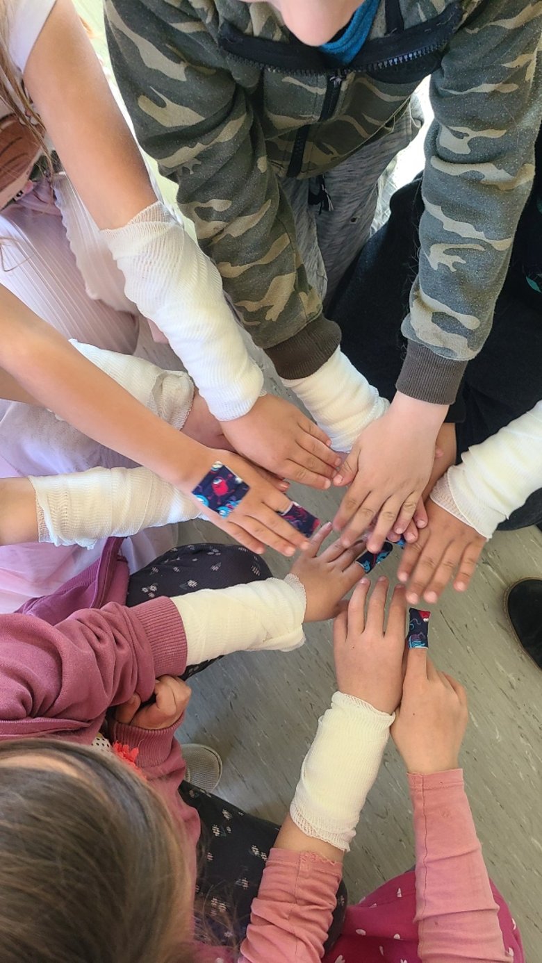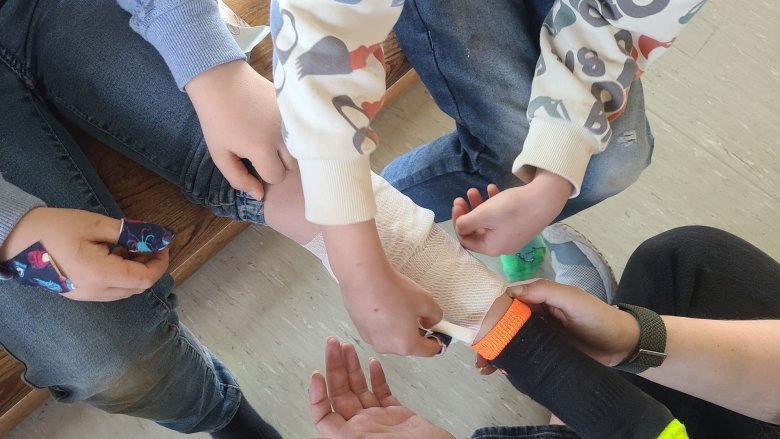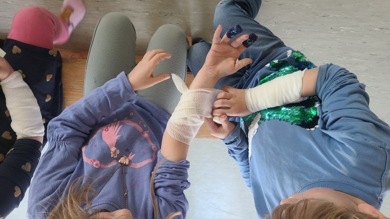 Als kompetente Referentin stand Jana Kreuzer-Krämer vom DRK Kreisverband Gelnhausen-Schlüchtern zur Verfügung. Die Kinder übten, ein Pflaster für Fingerkuppen zu schneiden und zu kleben oder einen Verband an einem verletzten Arm oder Bein anzulegen. Doch auch sehr ernste Fragen wurden besprochen. Was tun, wenn jemand bewusstlos wird! Die Kinder wurden mit der stabilen Seitenlage vertraut gemacht und übten diese auf dem Fußboden. Jedes Kind mimte einmal die erkrankte Person und einmal den Ersthelfer.