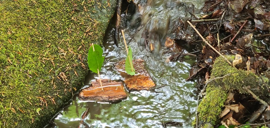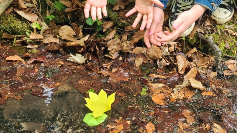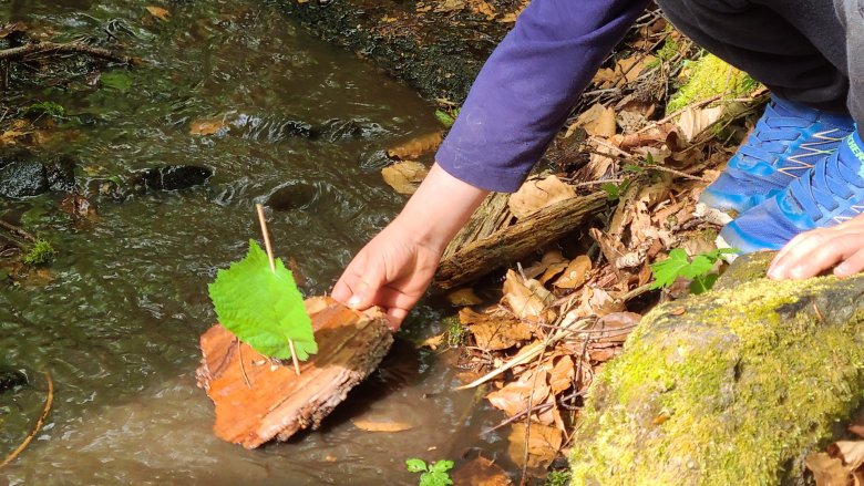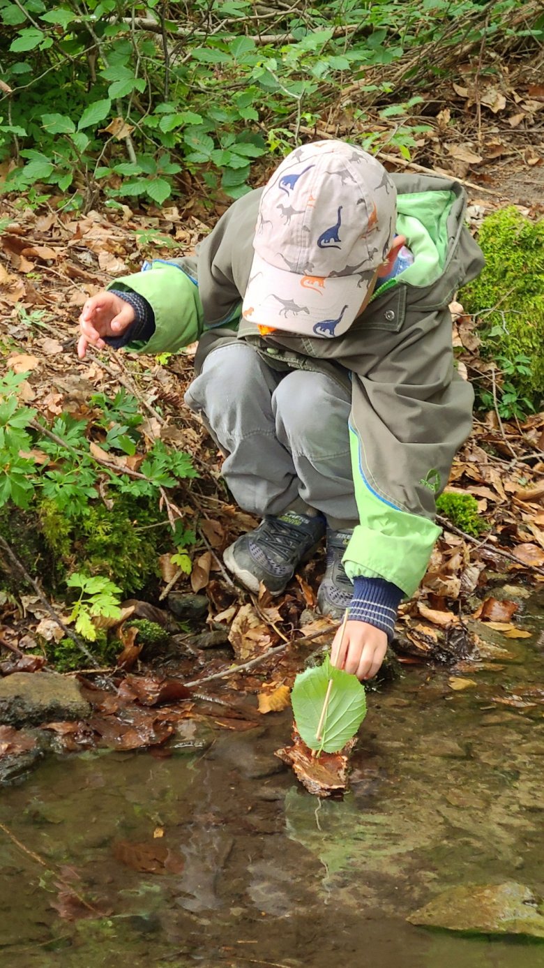 In diesem Sinne standen Ende Mai und Anfang Juni an zwei Tagen die Schulstürmer der Kindertagesstätten Regenbogen und Schatzkiste mit ihren Rucksäcken bereit. Heike Brandt hatte ihre Hündin Jonna dabei und. Die Gruppe spazierte in den Ziegenwald. Das ist ein Insidername, der in der Kita entstanden ist und in allen Kindergruppen verstanden wird. Gemeint ist das Waldstück oberhalb des Ziegengeheges, das die Kinder auf dem Weg am Waldrand entlang erreichen und auf ihren Ausflügen regelmäßig besuchen. Vor den Infotafeln des Parcours erklärte die kompetente Führerin den Kindern Zusammenhänge rund um Brachttals Wasserversorgung. Für Kinder ist gut zu verstehen, dass es im Vogelsberg aufgrund früherer Vulkantätigkeit jede Menge undurchlässiges Basaltgestein gibt, dass das Wasser sich dort sammelt und Quellen entstehen. Am Bach bekamen sie gezeigt, wie man mittels kleinster Tierchen, die sich unter Steinen im Wasser finden, auf die Wasserqualität schließen können. Steinfliegenlarven, Eintagsfliegenlarven und Köcherfliegenlarven lassen zum Beispiel auf eine gute Wasserqualität schließen und die Kinder fanden einige davon. Nach dem Frühstückspicknick durfte der Bach barfuß erkundet werden. Unter Anleitung der Erwachsenen bauten die Kinder Boote und bastelten Zauberblumen, die die Vertreterinnen des Vereins Wasser von Brachttal vorbereitet hatten. Die Blütenblätter von Papierblumen wurden nach innen gefaltet. Die Blume, auf ruhiges Wasser im Bach gelegt, entfaltet sich schließlich wie von Zauberhand.