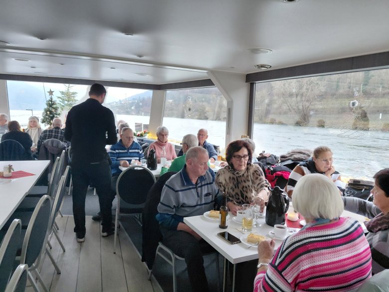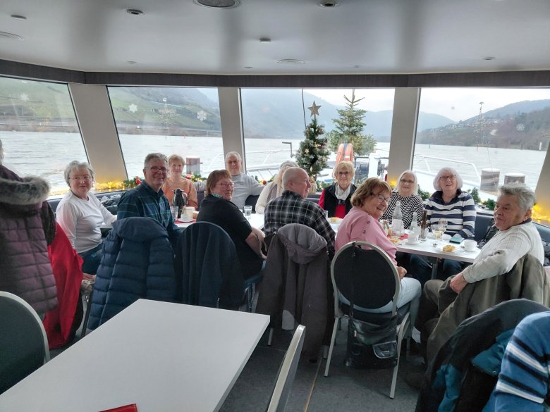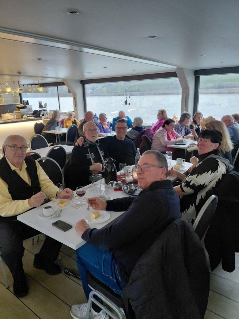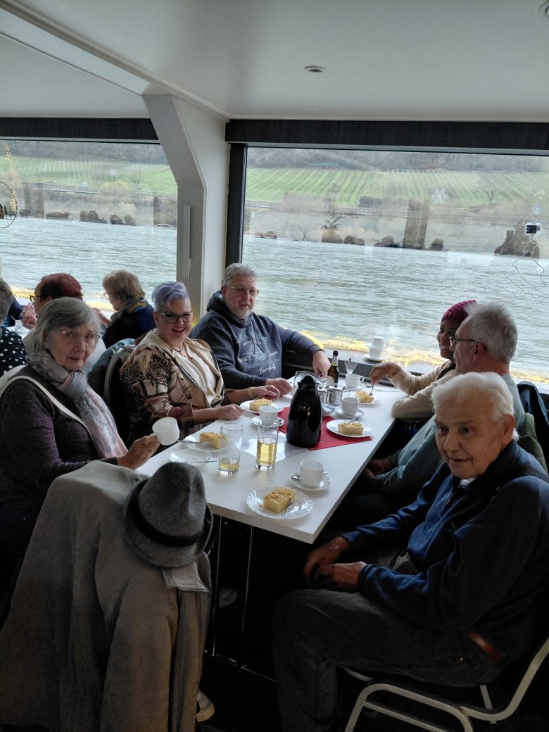 Pünktlich um 9.30 Uhr starteten zwei voll besetzte Busse in Richtung Bingen, wo die Gruppe gegen 12.30 Uhr ankam. Von dort aus ging es direkt an Bord eines Ausflugsschiffes, das die Teilnehmenden zu einer vierstündigen Rundfahrt über den Rhein einlud. Während der Fahrt konnten die Gäste ein warmes Mittagessen genießen, später wurden Kaffee und Kuchen serviert. In gemütlicher Atmosphäre und mit Blick auf die vorbeiziehende Flusslandschaft bot die Schifffahrt viel Gelegenheit zum Austausch und zum gemeinsamen Erleben.