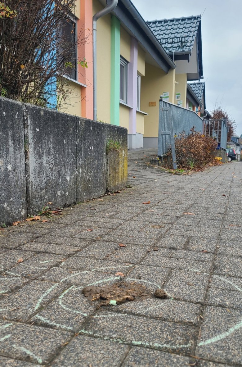 Erfahrene Passanten gehen auf der Straße, um nicht in einen Hundehaufen zu treten. Kein gutes Vorbild für die Kinder, vor allem die jüngsten, die noch lernen müssen, sich in dem Verkehrschaos in Bring- und Abholzeiten sicher zwischen den Autos und Bussen zu bewegen. Zyniker behaupten, wo kein Hundehaufen liegt, steht ein verkehrswidrig geparktes Auto eines lauffaulen Elternteils.