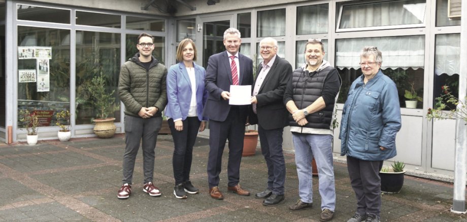 Es ist ein Projekt, das in Brachttal bereits seit 2011 vorangetrieben wird: Die schrittweise Modernisierung der Mehrzweckhalle in Neuenschmidten. Nachdem die Halle ohne Fördermittel aus der Dorfentwicklung mit einem neuen Brandschutzkonzept, LED-Beleuchtung und einem neuen Dach ausgestattet worden ist, soll nun das aus dem Jahr1967 stammende Foyer und der Eingangsbereich inklusive der Garderobe und Toilettenanlagen mit Hilfe des Landes Hessen erweitert und umgebaut werden. Einen Förderbescheid aus Mitteln des hessischen Dorfentwicklungsprogramms in Höhe von 120.000 Euro überreichte Erster Kreisbeigeordneter Andreas Hofmann nun an Bürgermeister Wolfram Zimmer, im Beisein seines Ersten Beigeordneten Alexander Potsis und den beiden Beigeordneten Ursula Kaiser und David Goffitzer. „Die Mehrzweckhalle erfüllt für die Menschen in Brachttal eine wichtige Aufgabe, denn dort treffen sich Vereine. Dort können aber auch größere Informationsveranstaltungen stattfinden. Diesen Ort der Begegnung aufzuwerten und ihn fit für die Zukunft zu machen, ist nachhaltig, weil es direkt den Menschen zugutekommt, die ihn rege nutzen“, stellte Andreas Hofmann fest.