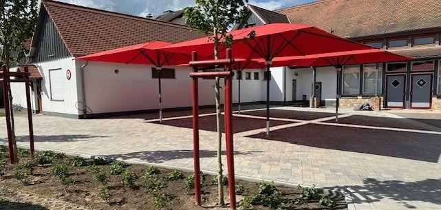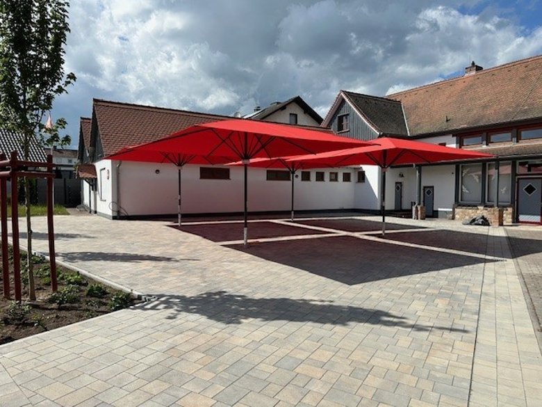 Besonders ins Auge fallen die markanten roten Sonnenschirme, die nicht nur farbliche Akzente setzen, sondern auch für angenehmen Schatten und Aufenthaltsqualität sorgen. Der frisch verlegte Pflasterbelag und die überarbeitete Bepflanzung tragen ebenfalls zu einem stimmigen Gesamtbild bei. Die ersten Rückmeldungen aus der Bevölkerung sind positiv – es gibt bereits mehrere Anfragen zur Nutzung des neuen Innenhofs.